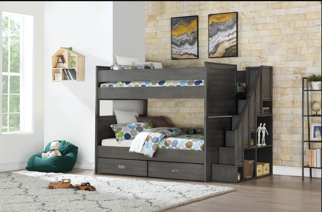 These Full Over Full Bunk Beds with stairs feature six open-concept bookshelves on the end and are the ideal choice for parents wanting a bunk bed that has a modern contemporary flare, but manages to retain a classic look and feel that complements their child’s room no matter its style or aesthetic for years to come.